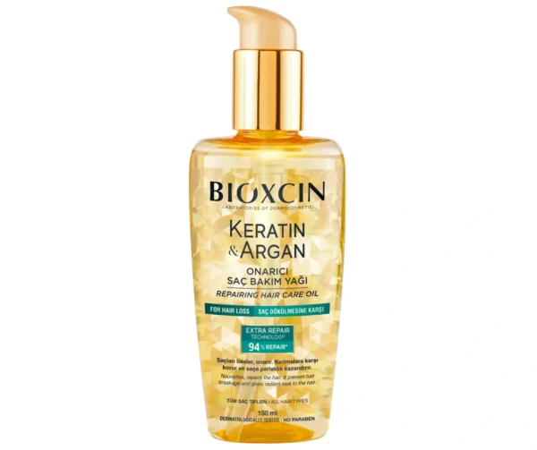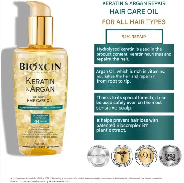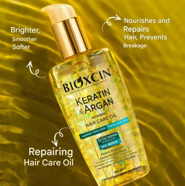 روغن مو ترمیم کننده کراتین و آرگان بیوکسین Bioxcin مناسب موهای آسیبدیده و مستعد ریزش | حجم 150 میل