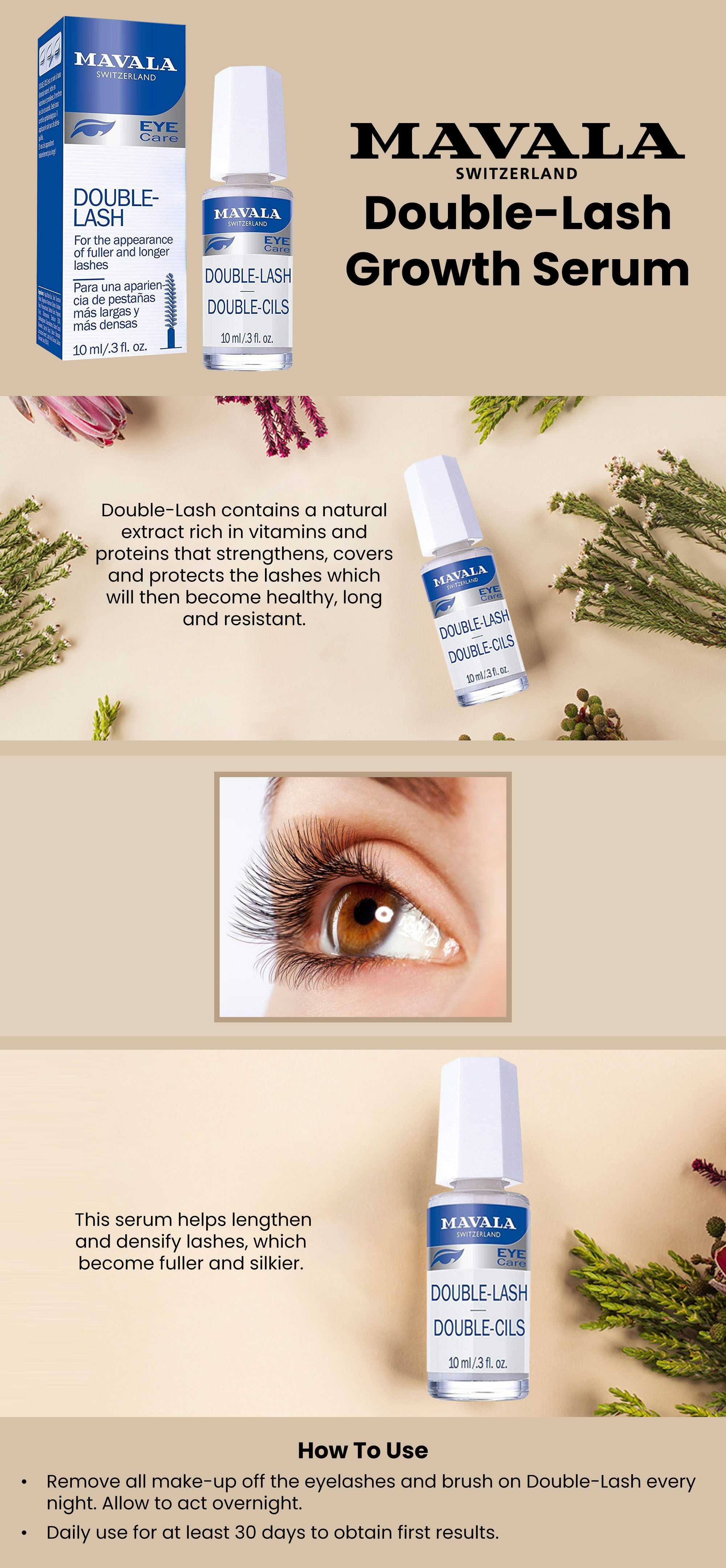 مژه ها یک عنصر اساسی در زیبایی چهره هستند. محلول تقویت مژه ماوالا دابل لش Double-Lash حاوی یک عصاره طبیعی سرشار از ویتامین ها و پروتئین هاست که باعث تقویت ، پوشش و محافظت از مژه ها می شود. در نتیجه استفاده از این محلول مژه ها سالم، مقاوم ، بلندتر و پرپشت تر می شوند. این سرم به طولانی تر و متراکم تر شدن و در عین حال نرم و ابریشمی شدن مژه ها کمک می کند.
