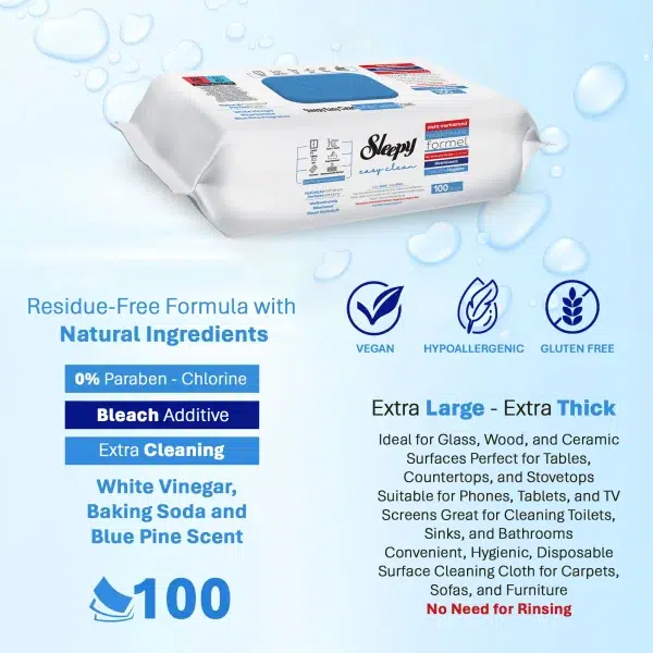 دستمال مرطوب همه کاره اسلیپی مدل Easy Clean مخصوص سطوح با بسته 100 عددی، یک محصول تمیزکننده طراحی شده برای سطوح مختلف منزل است. این دستمالها به طور خاص برای پاک کردن انواع آلودگیها از سطوح گوناگون مانند شیشه، سرامیک، چوب، صفحهنمایشها، و همچنین فضاهای آشپزخانه و حمام فرموله شدهاند.